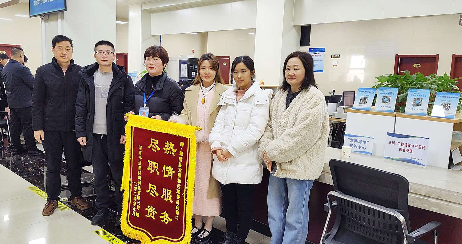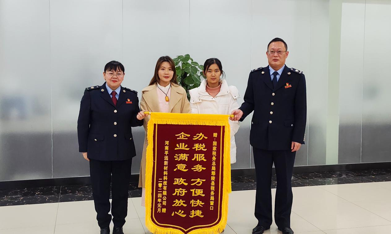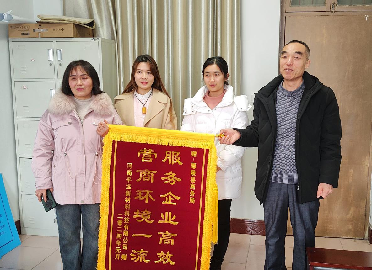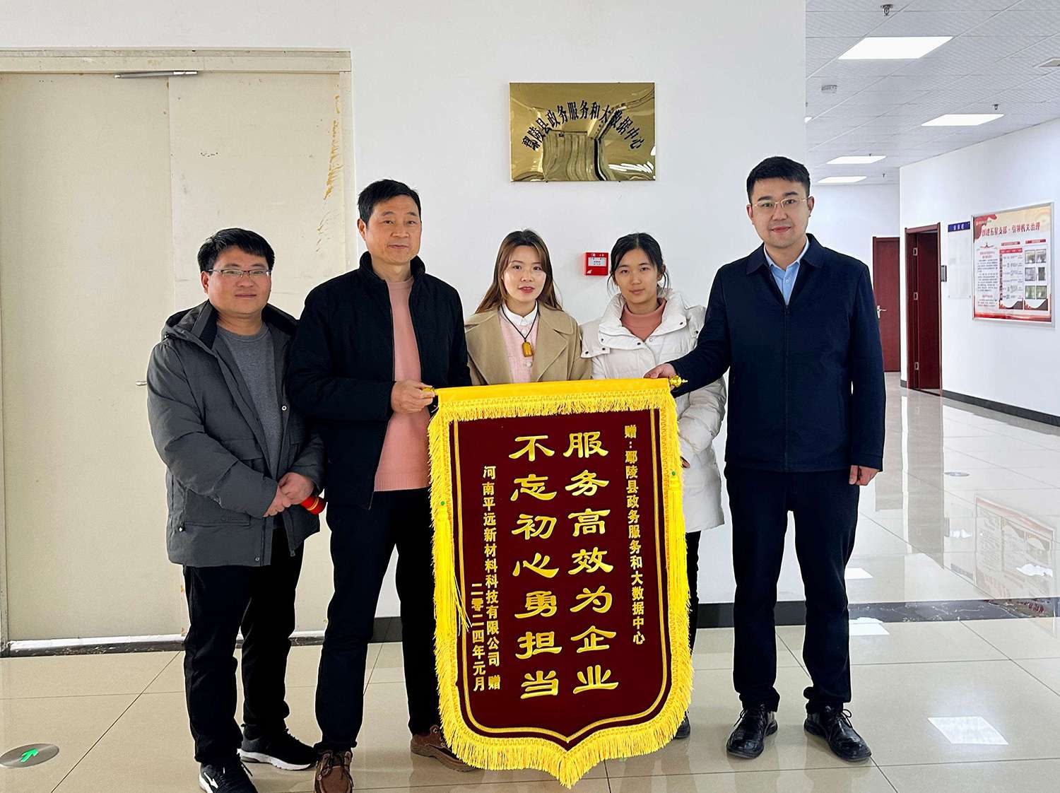2024年1月11日至12日,河南平遠(yuǎn)新材料科技有限公司總經(jīng)理黃恩明先生、品牌總監(jiān)黃茂女士等代表將八面飽含真摯謝意的錦旗分別贈(zèng)給鄢陵縣先進(jìn)制造業(yè)開發(fā)區(qū)管理委員會(huì)、縣政務(wù)服務(wù)中心市場(chǎng)監(jiān)督窗口、許昌市生態(tài)環(huán)境局鄢陵分局窗口、商務(wù)局、科技與工業(yè)信息化局、政務(wù)服務(wù)和大數(shù)據(jù)中心、發(fā)展和改革委員會(huì)窗口、國(guó)家稅務(wù)總局鄢陵縣稅務(wù)局窗口,對(duì)政府相關(guān)部門在公司落戶鄢陵的過(guò)程中給予的傾心服務(wù)和大力支持表示衷心感謝。